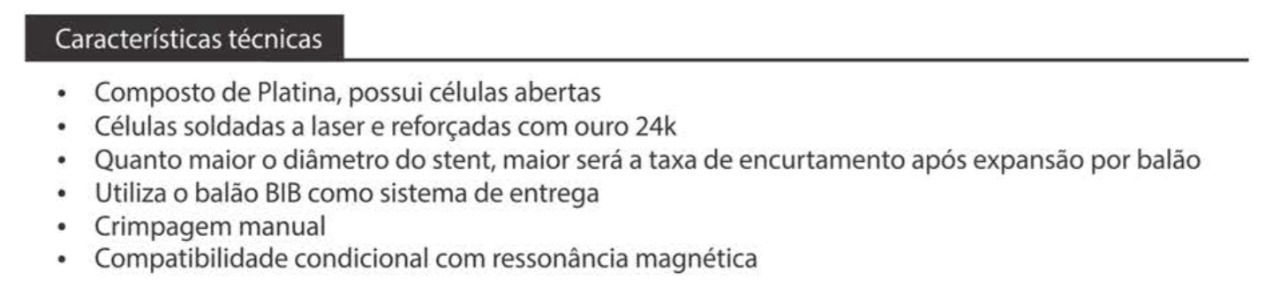 Composto por liga metálica de platina (90%) e irídio (10%), tratado termicamente e disposto na forma de trama (ziguezague) em filamentos soldados a laser e reforçados em ouro 24K, diminuindo a ocorrência de possíveis fraturas.