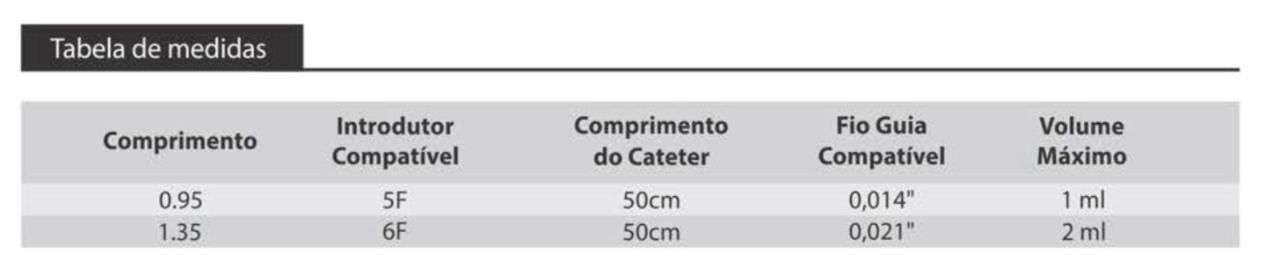 Desenhado para permitir excelente orientação e navegabilidade, possuindo uma marca radiopaca no centro do balão. Baixo perfil com shaft distal flexível e tempo de deflação extremamente rápido.